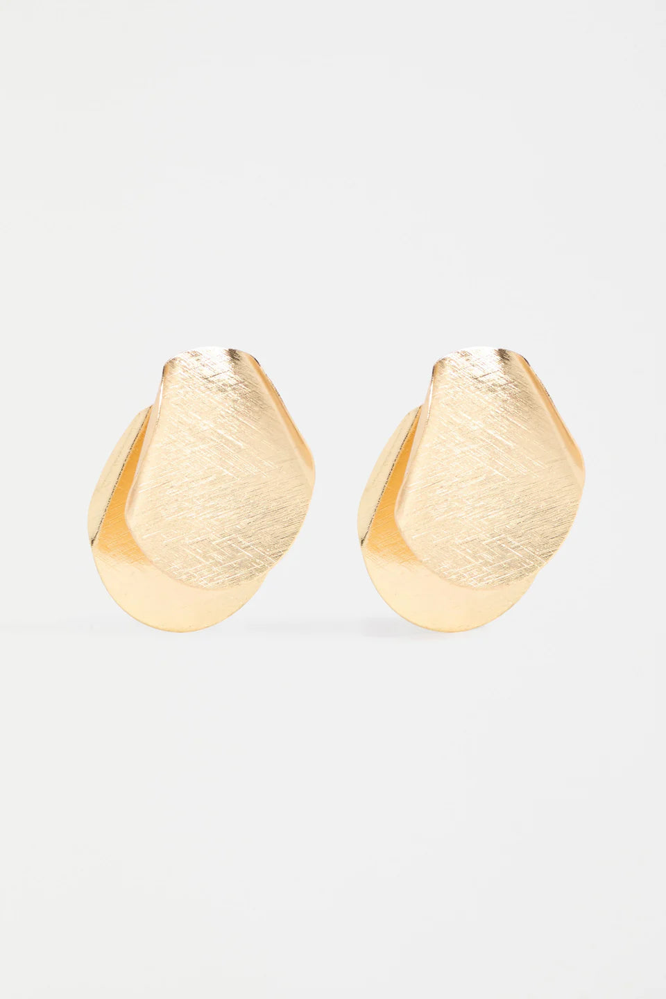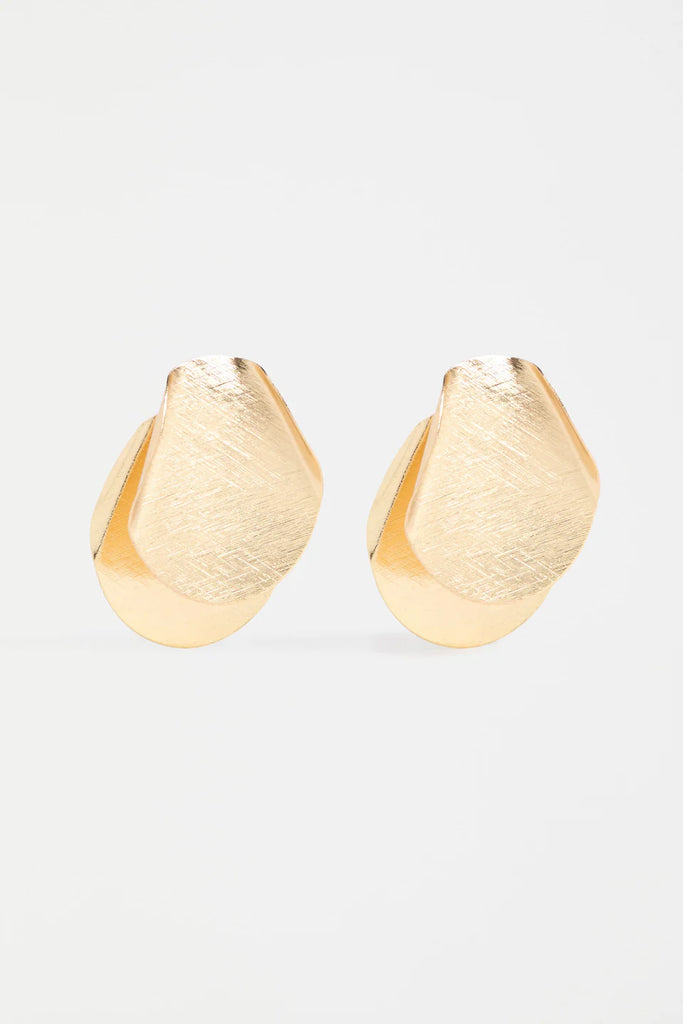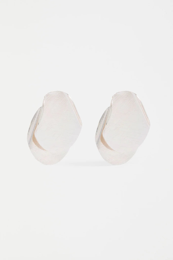 The Villt Earrings are a unique sculptural design of two petal-like shapes crafted from thin, shiny metal with a cross hash brushed finish. Comprised of two components that sit at the front and back of the ear, attached via the stud post back. This distinctive, striking design is perfect for dressing up a simple office outfit or elevating an evening look.