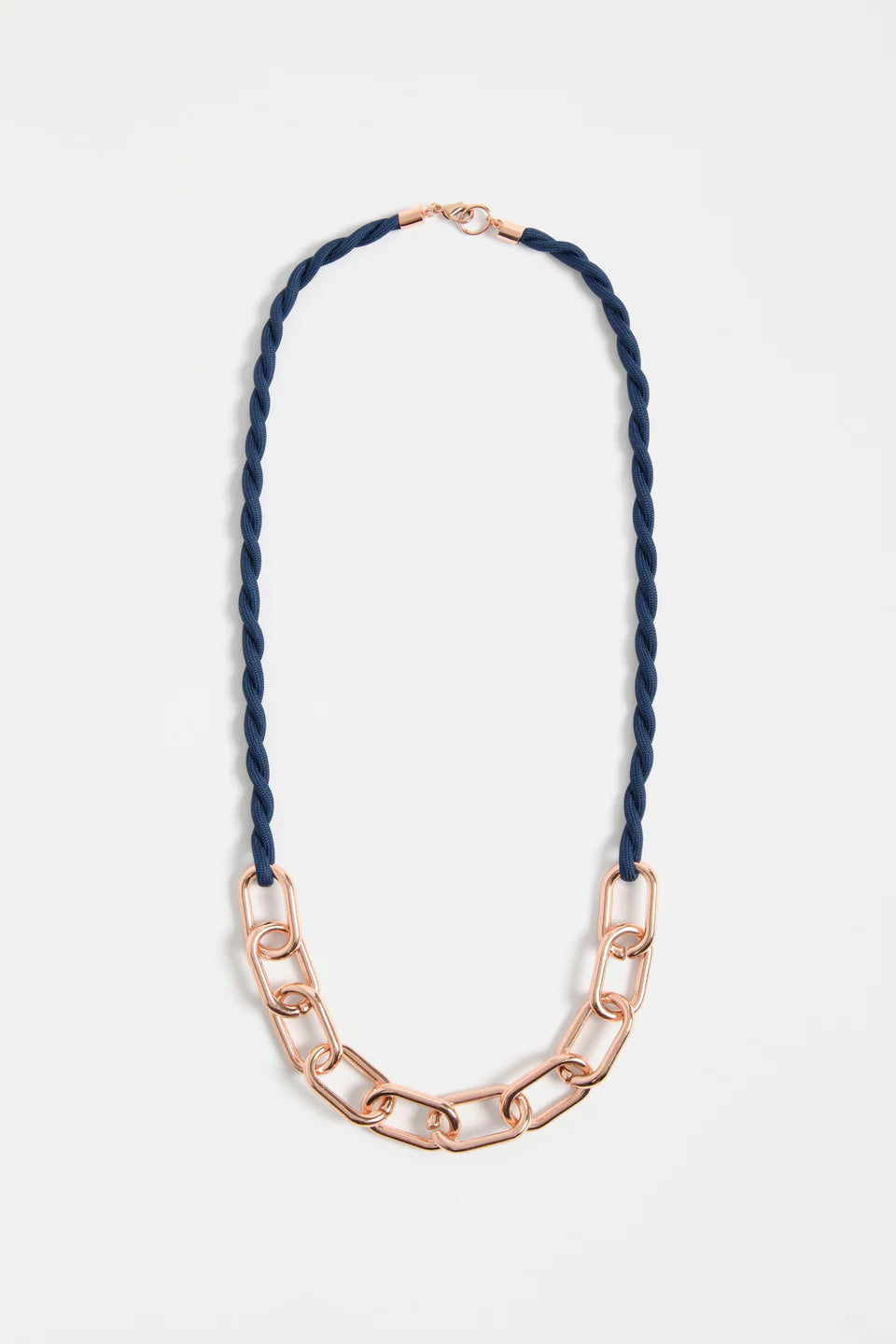 The Torss Long Necklace features thick oval metal links interlocked together and attached to a long twisted cord made from recycled polyester. This mixed materials style provides textural interest while adding a subtle pop of colour and edge to your outfits. Available in shiny Rose Gold and navy cord and Gunmetal and pine green cord.