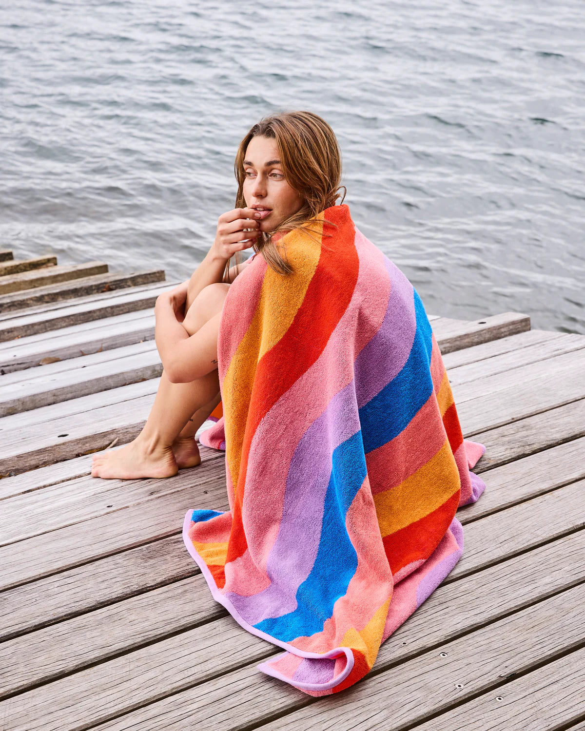 Soak up the sun, salt and some serious leisure time with our plush Surfs Up Terry Beach Towel, your ultimate sidekick for a summer spent chasing waves and stretching out seaside. Soft, absorbent and super sized for full-body lounging, it’s made for sandy toes, salty skin and long, lazy beach days. Whether you're drying off post-dip or claiming your patch of paradise, this towel brings the sunshine vibes wherever it goes. Made from 100% cotton terry featuring a curvy wave pattern of red, golden yellow, melon pink and blue with lilac purple woven edge finish.