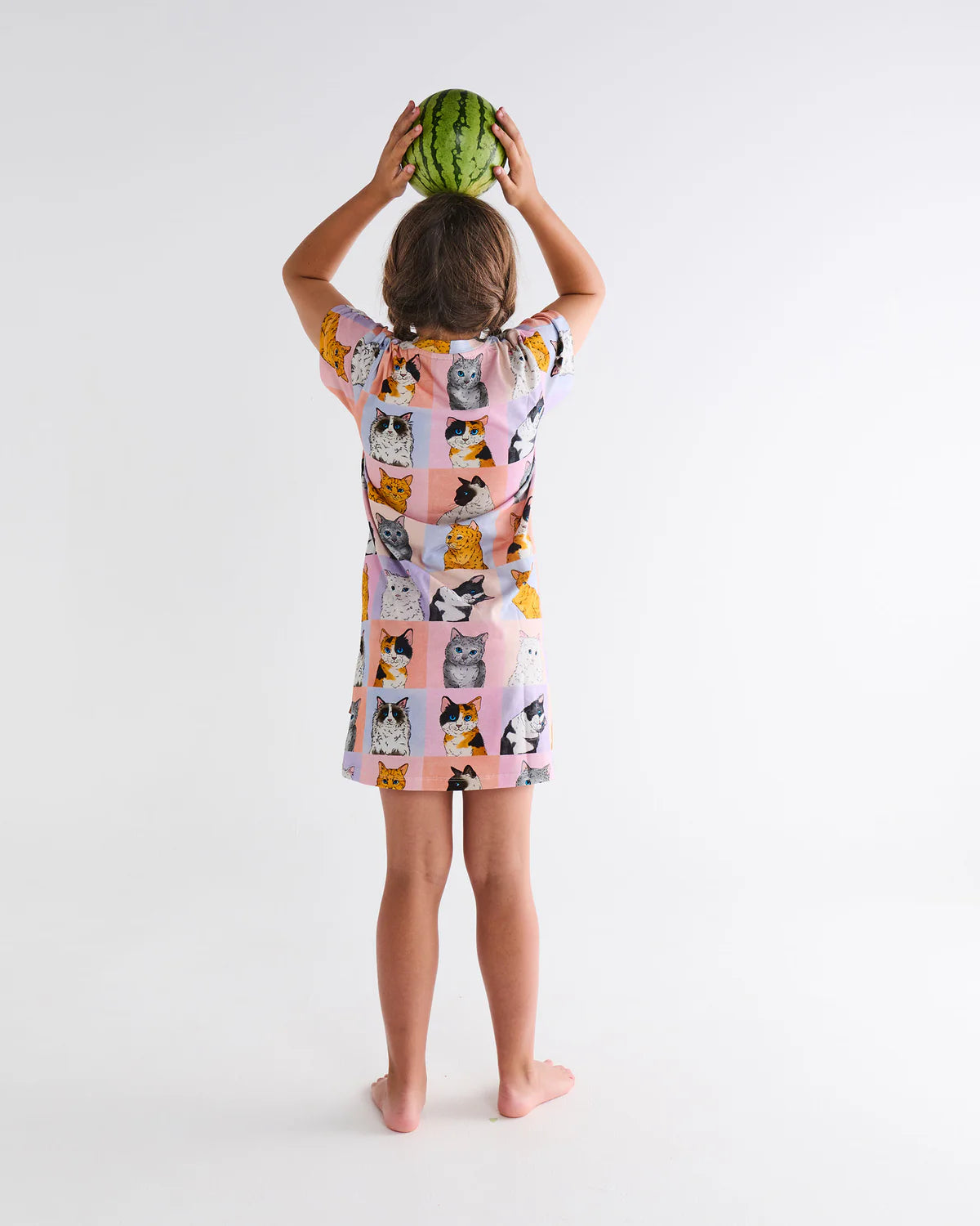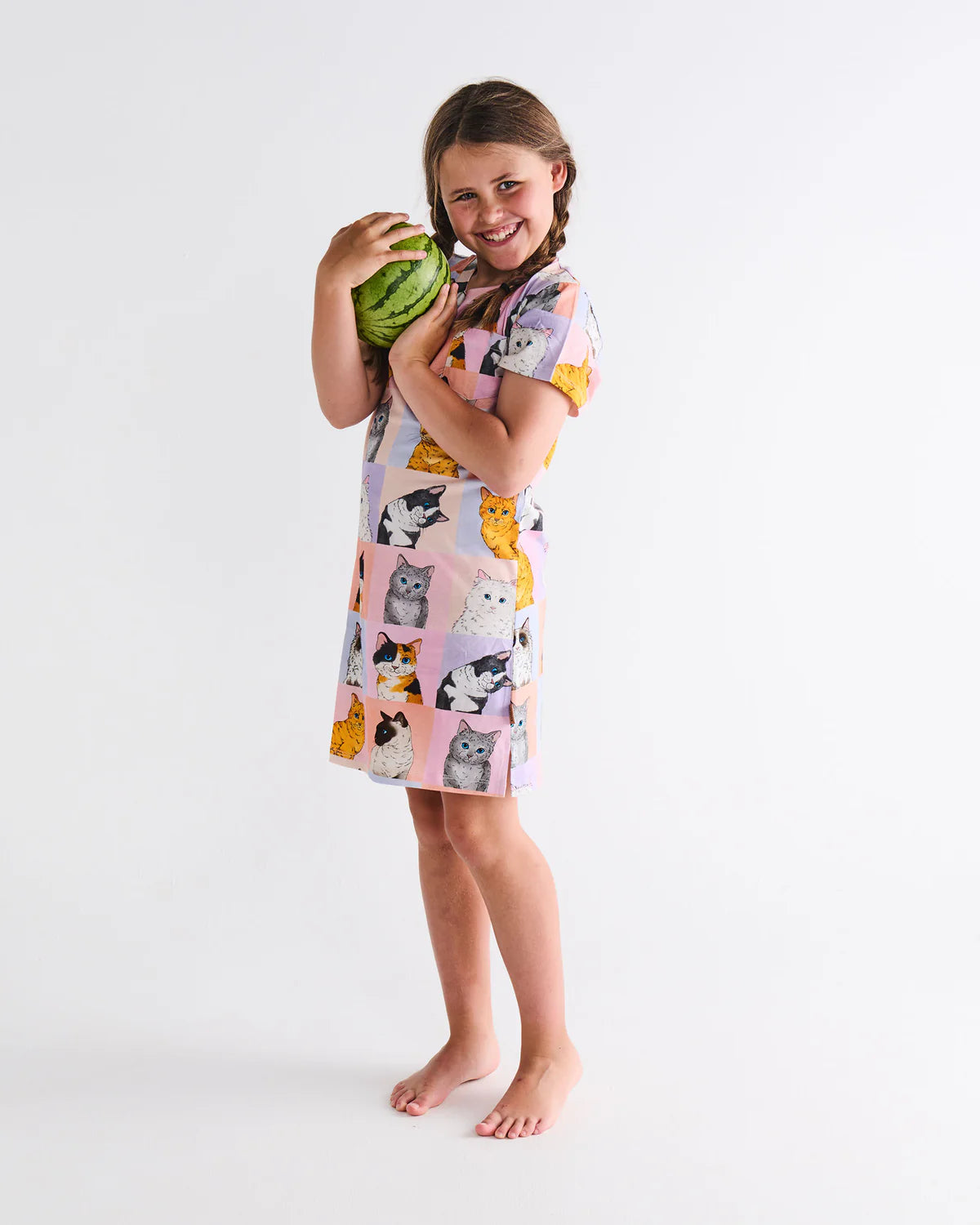 Sunshine, giggles, and bedtime bliss! Our Kitty Cat Kids Organic Cotton Short Sleeve Nightie is soft, breathable, and made for easy summer dreaming. With a comfy fit and cheerful Kip&Co vibes, it’s perfect for bedtime stories, sleepovers, or just lounging around in summer style. Fun, light, and totally kid-approved - dreamy nights start here! Featuring a line-up of the cutest kitty cat portraits with pastel backdrops in pink, purple and blue.