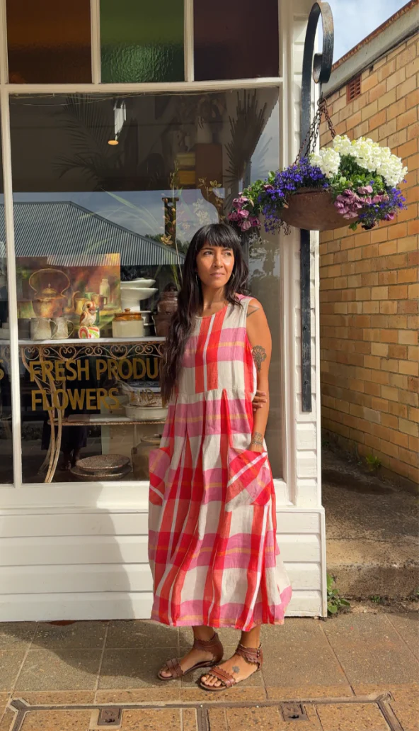 This 100% French Flax linen dress is the perfect blend of comfort and chic style. Designed in a joyful Orange Check, it brings a fresh twist to the beloved Sartène silhouette. Sleeveless and breathable, it features a flattering drape that falls below the knee, finished with a tulip hemline for a graceful touch.