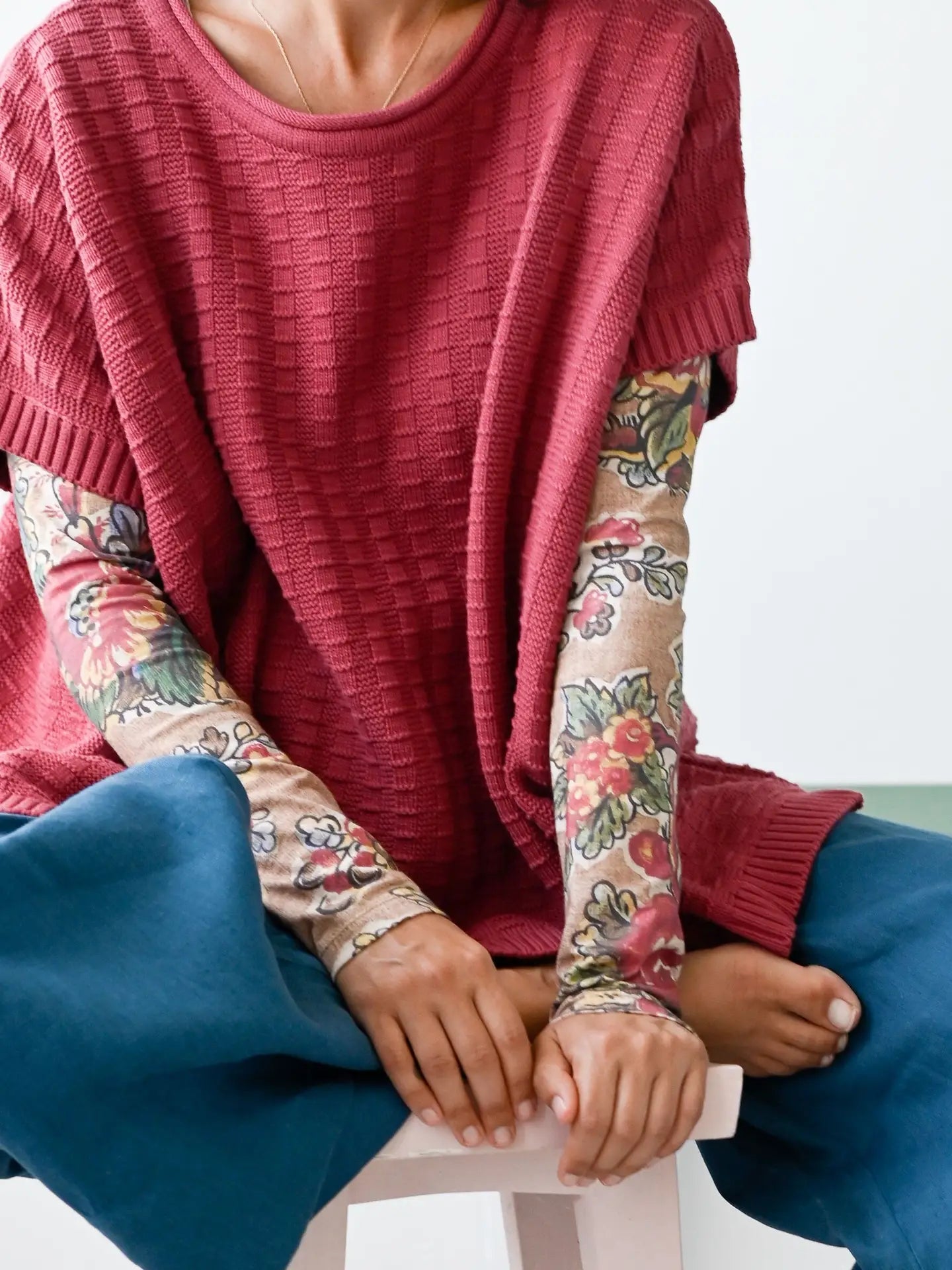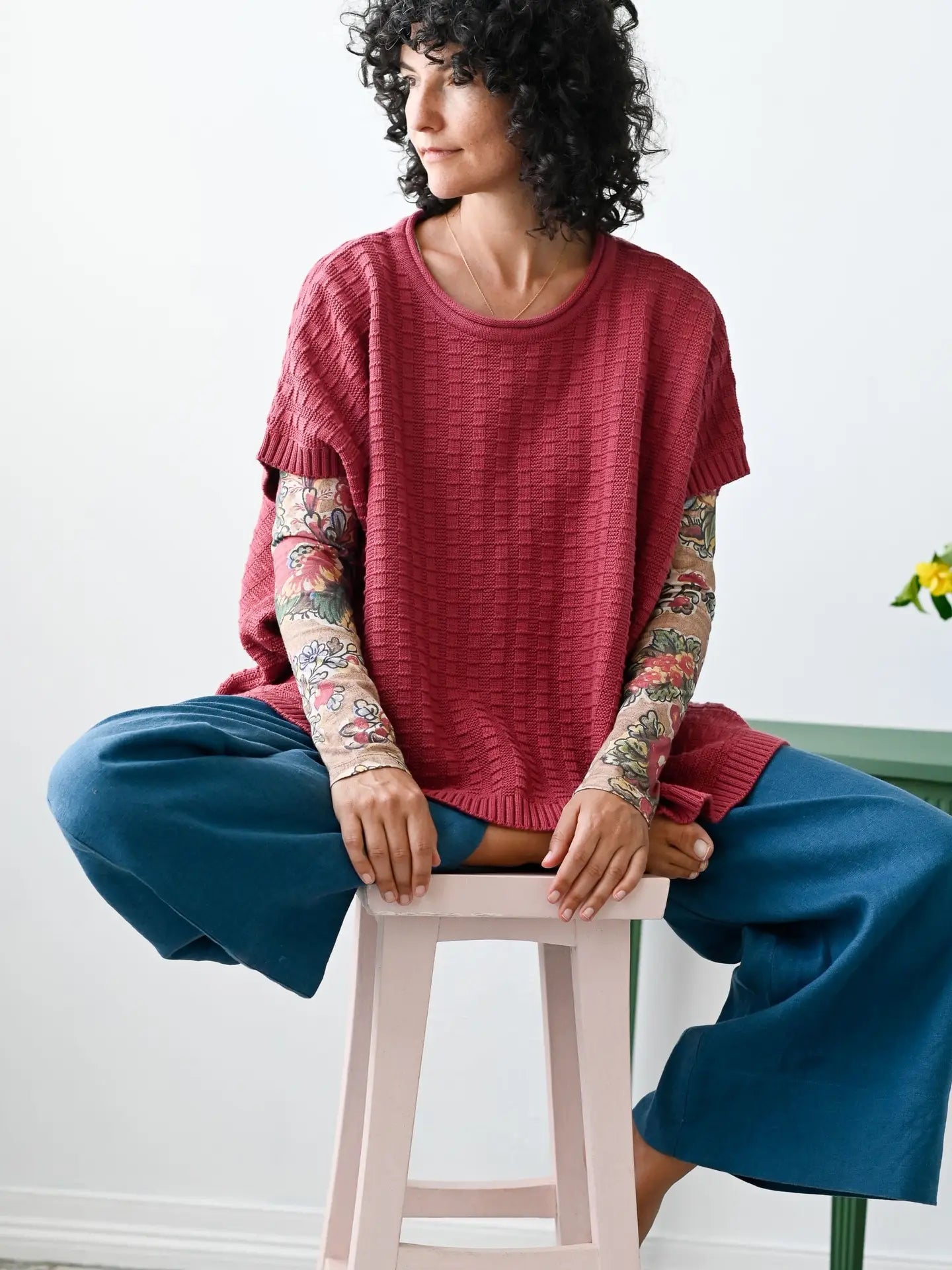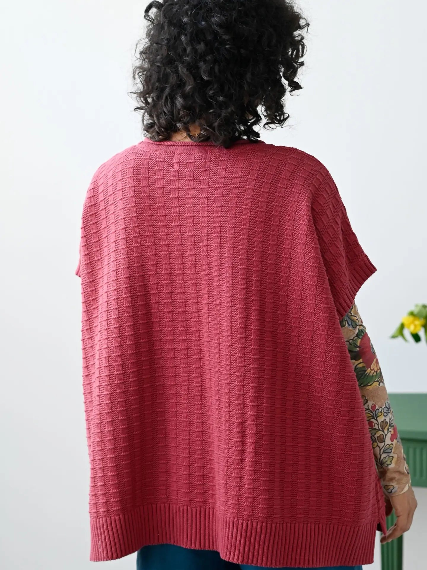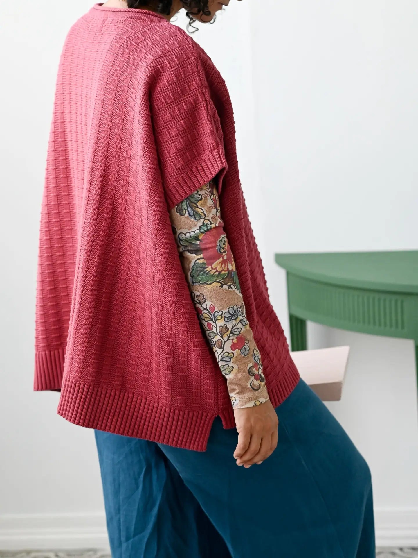 Rennie is a new addition to the knitwear range this season. Comfy, loose fit poncho style vest. With a subtle jacquard pattern in a pretty shade of pinky red, this colour is Earth Red.