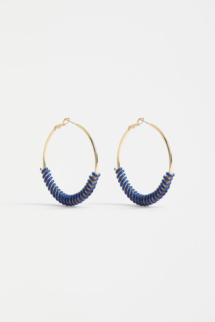 The Vrid Hoop Earring showcase a large hoop design with a fun twist. A coiled, spiral wraps around the bottom of the hoop in a colour coated metal. These large hoops make a sophisticated statement, while the lightweight design makes them perfect for desk-to-dinner and beyond